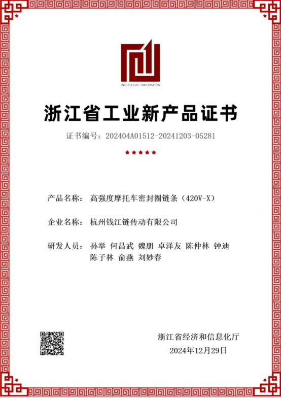 Lanac motocikla visoke čvrstoće s uljnim brtvljenjem, model 420V-O(X) koji je razvio i proizveo Hangzhou Qianjiang Chain Industries Co., Ltd. prošao certifikaciju novog proizvoda na razini provincije