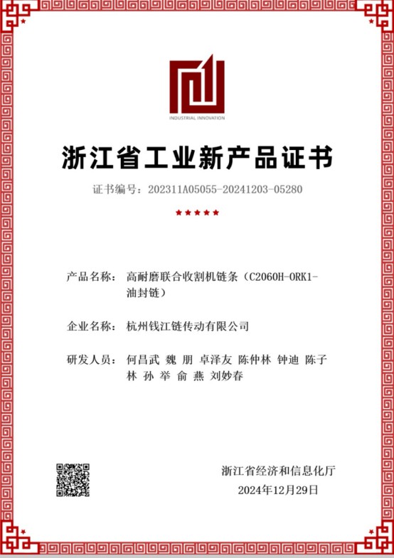 Kako bi riješila te probleme, tvrtka je razvila "lanac kombinirane žetve C2060H-ORK1 visoke otpornosti na habanje, uljno zabrtvljen lanac". Optimiziranjem dizajna strukture lanca, upotrebom visokokvalitetnog legiranog konstrukcijskog čelika, usvajanjem CNC kompozitne tehnologije preciznog žigosanja i procesa izotermalnog kaljenja toplinskom obradom, snaga i površinska tvrdoća komponenti lanca su poboljšani, brtvljenje ulja za podmazivanje za dijelove s mrežom je poboljšano, otpornost na koroziju je povećana, a radni vijek produljen.