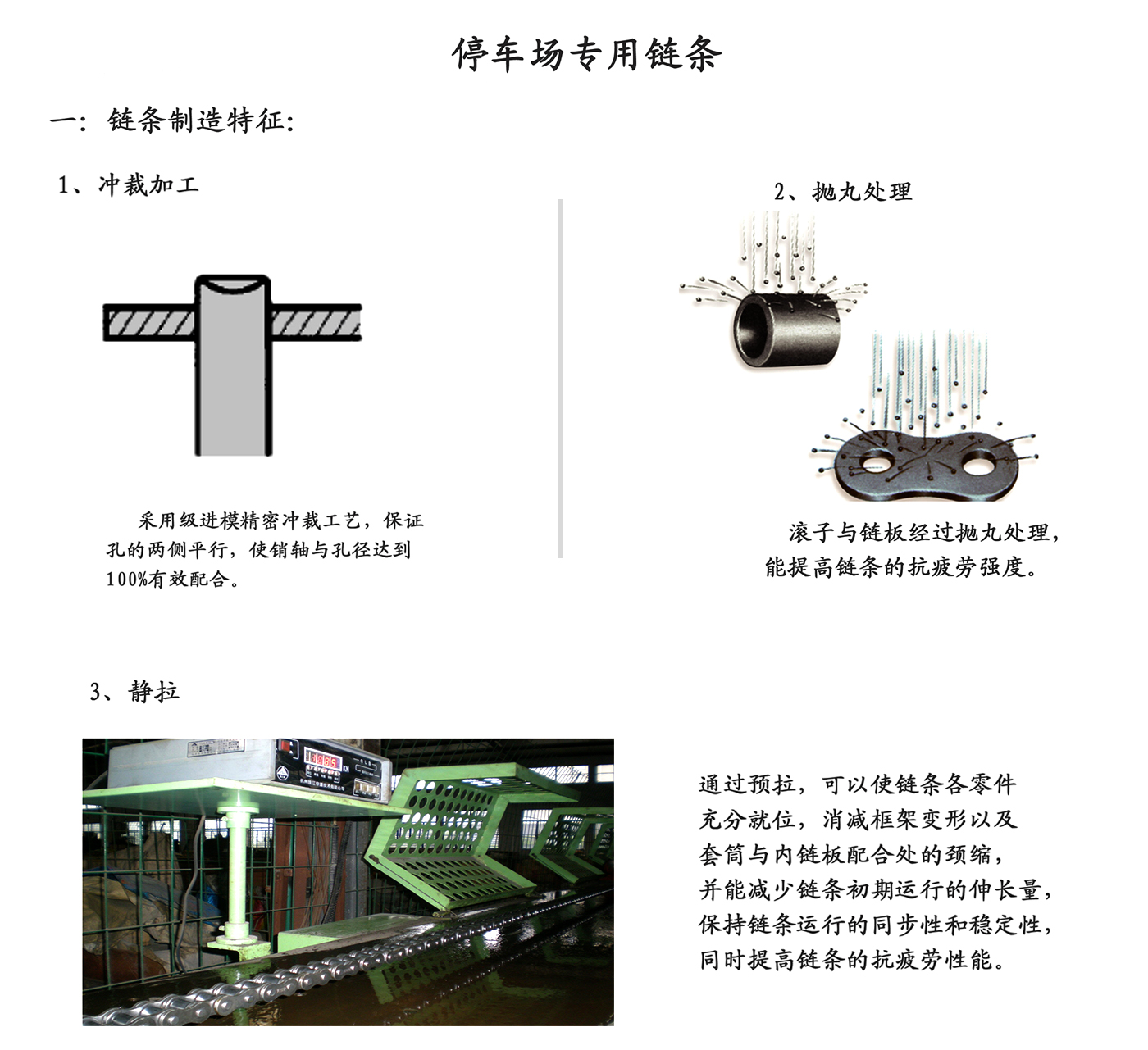 Lanac inteligentne trodimenzionalne opreme za parkiranje je prijenos drugog stupnja glavnog dijela opreme za parkiranje. Standard implementacije je JB/T11079-2011. Značajke uporabe lanca: velika nosivost, visoka vlačna čvrstoća (statička čvrstoća), minimalna vlačna čvrstoća je 10%-30% veća od običnih preciznih valjkastih lanaca', indeks izobličenja, točnost duljine lanca, otpornost na zamor itd. također su veći od običnih preciznih valjkastih lanaca'.