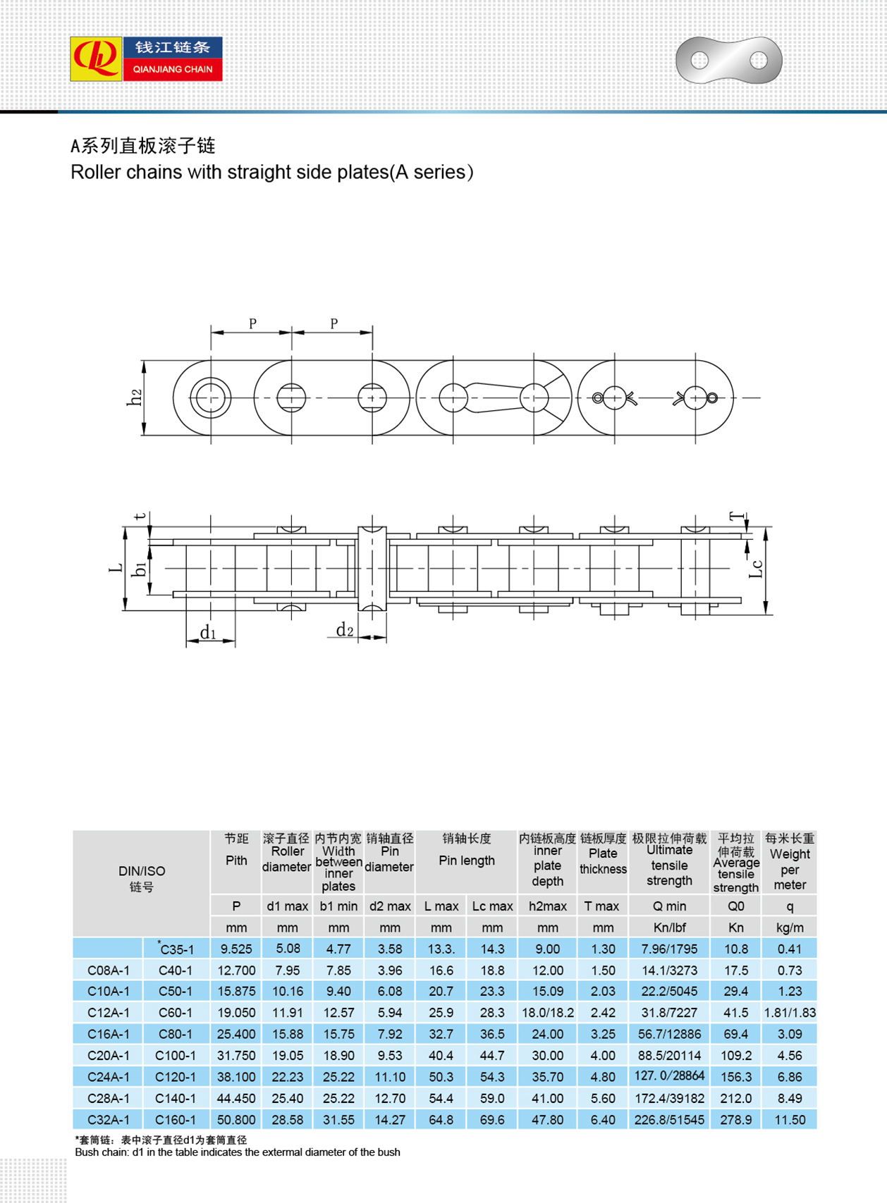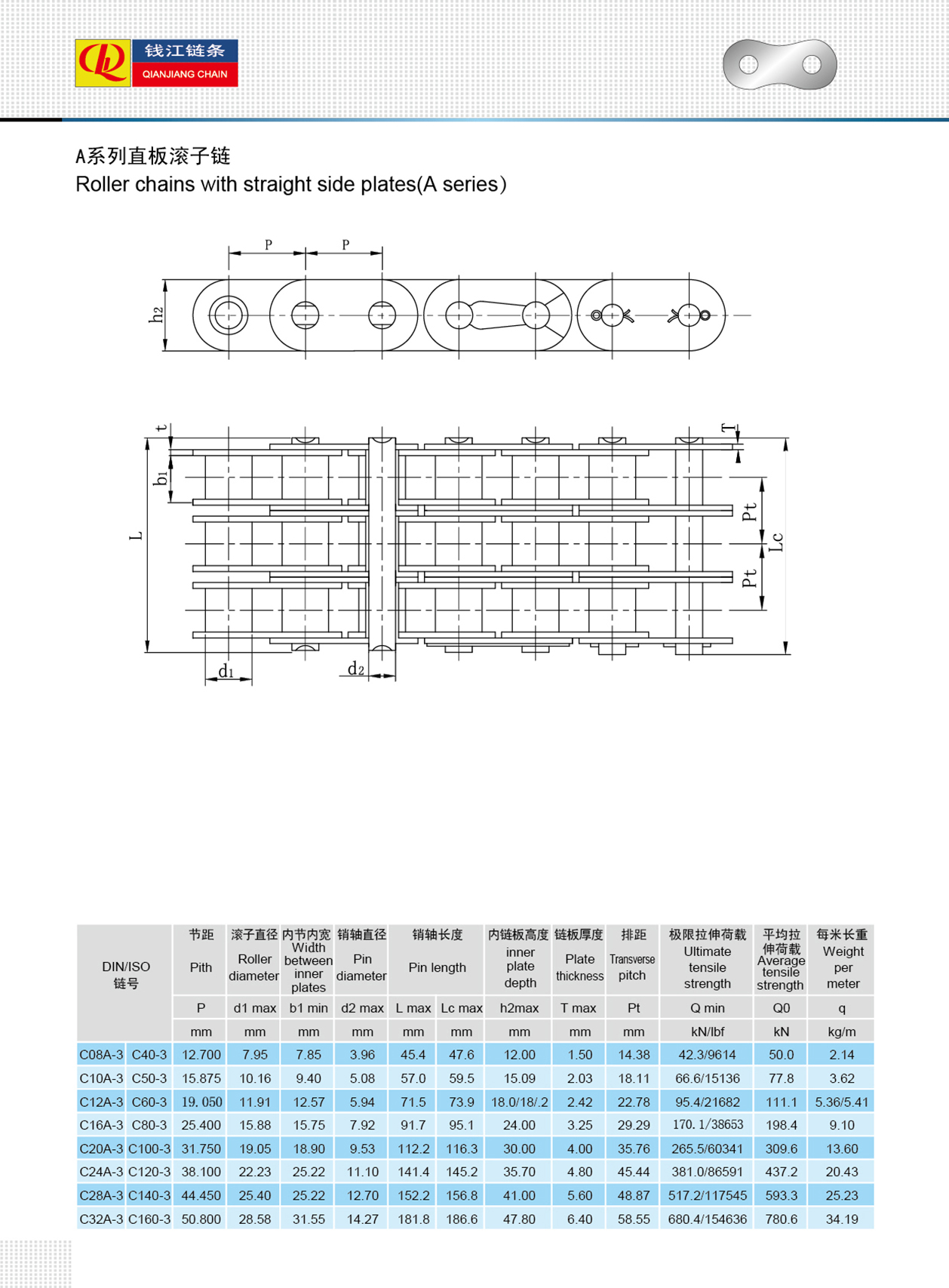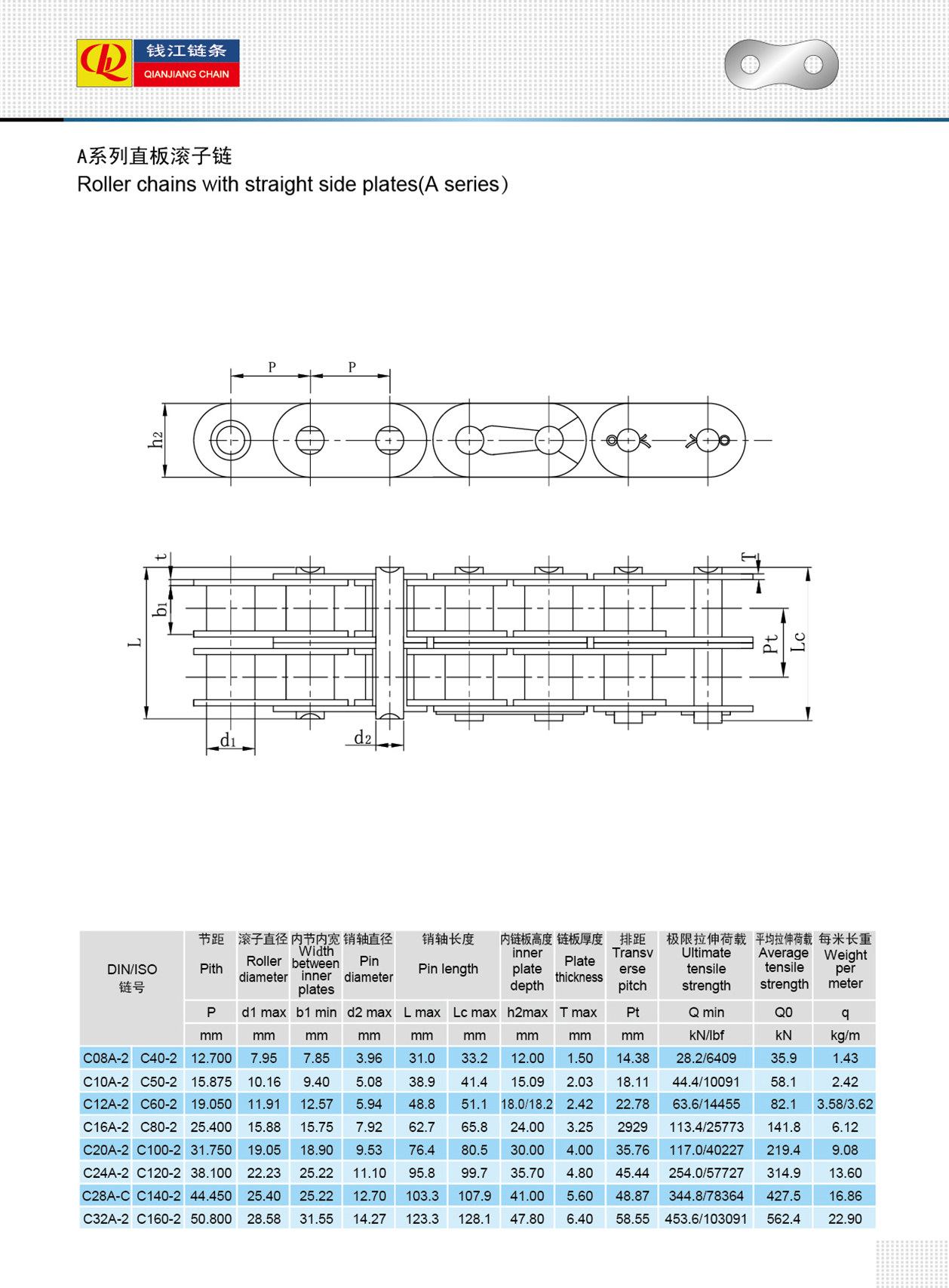 Valjkasti lanci s ravnim bočnim pločama (serija A) dizajnirani su za izdržljivost, učinkovitost i lakoću održavanja. Poznati po svom tihom radu, ovi lanci nude glatku i tihu izvedbu, što ih čini idealnim za okruženja u kojima je smanjenje buke važno. Materijali korišteni u konstrukciji ovih lanaca pomno su odabrani zbog svoje visoke čvrstoće, čime se osigurava da su manje skloni lomljenju, čak i pod zahtjevnim uvjetima.